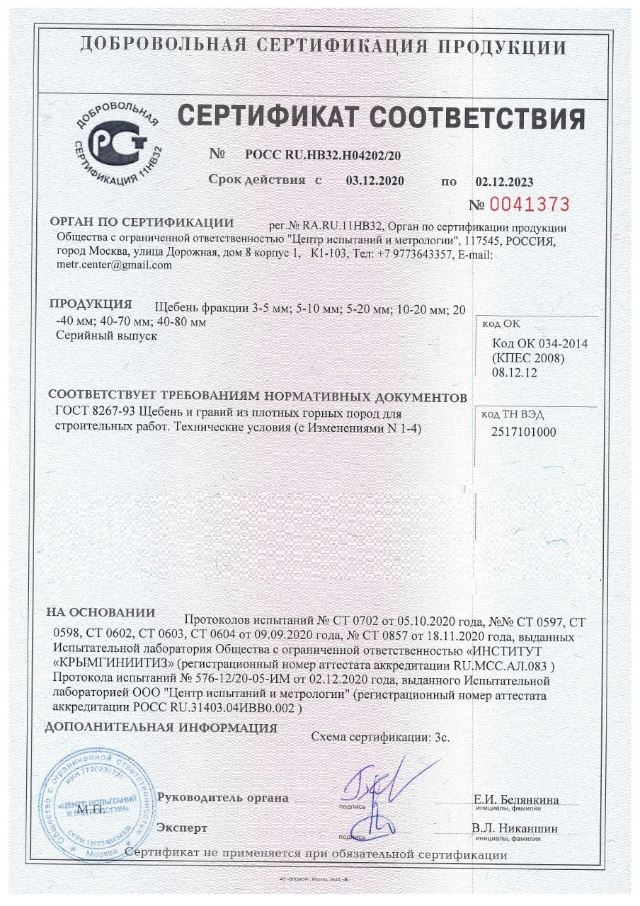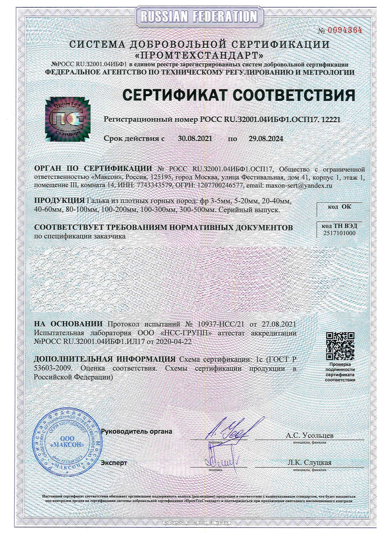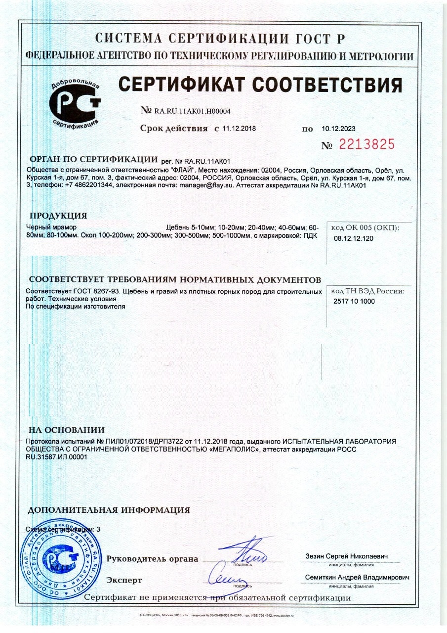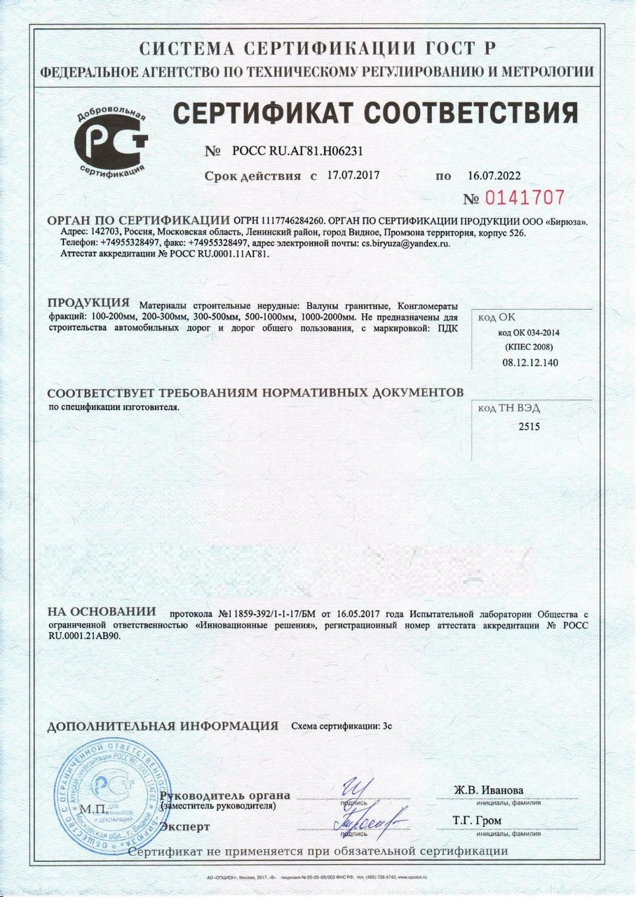 Сертификат соответствия – документ, подтверждающий соответствие продукции требованиям качества и безопасности, установленными для нее действующими стандартами и правилами. Наш камень, который Вы сможете заказать с доставкой в Вологде , обладает всеми необходимыми документами для реализации и при необходимости могут быть предоставлены все необходимые подтверждающие документы при поставке.